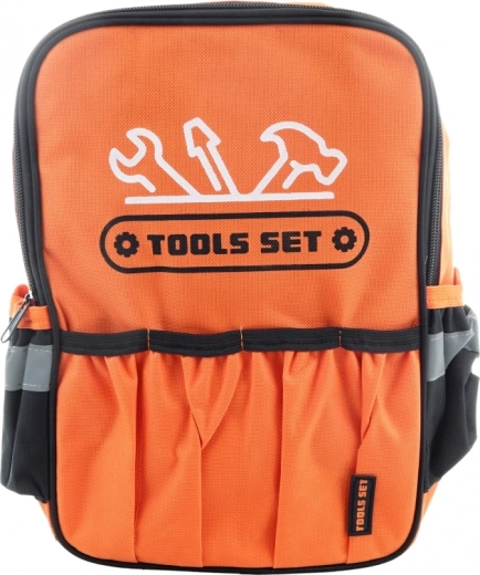 Popoln komplet orodja za otroke, ki je priložen v praktičnem tekstilnem nahrbtniku. Ta komplet vsebuje širok nabor orodij, vključno z: