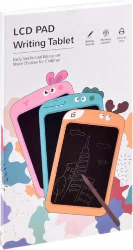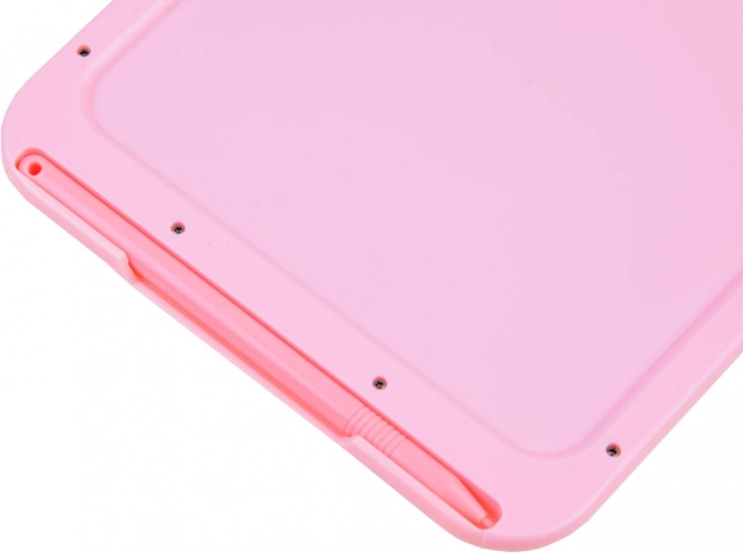 Zaradi lahke in tanke zasnove (pribl. 25 × 14,5 × 0,9 cm) tablico zlahka pospravite v nahrbtnik ali torbico. Vgrajeni nosilec za pisalo preprečuje izgubo, gumijasta ušeska pa dodajo igriv videz in prijeten oprijem. Napajanje zagotavlja baterija CR2025 (vključena v paketu).