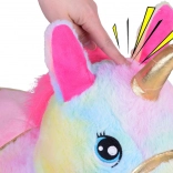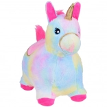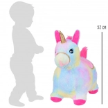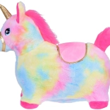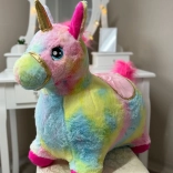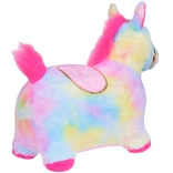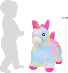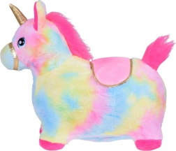 Ta skakajoči samorog združuje vzdržljivo napihljivo gumijasto telo in mehak, prijeten plišast prevlek v mavričnih barvah. Skrbno izdelani detajli, kot so izvezeni oči, zlata uzda, mehko tekstilno sedlo z zlatim robom ter rožnata griva in rep, bodo otroke navdušili. Med ušesi je skrita piščalka, ki vsako poskakovanje še dodatno popestri.