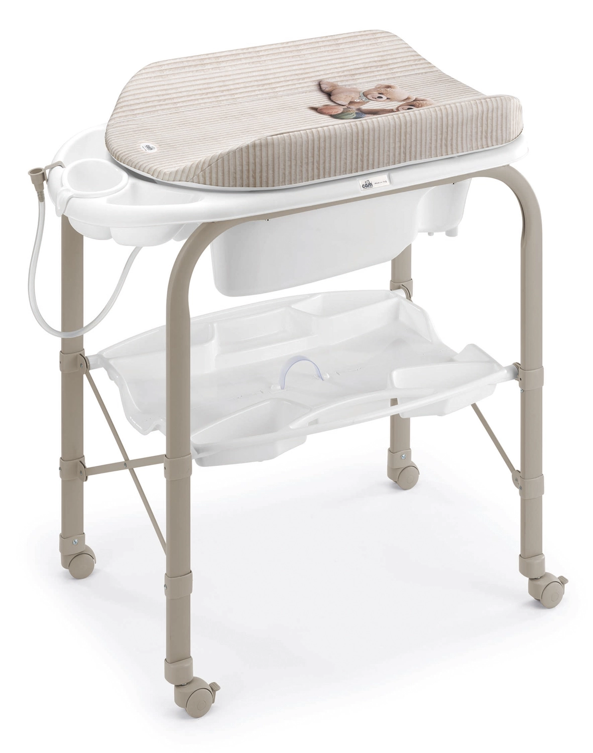 Previjalna miza Cambio je idealna izbira za starše, ki želijo praktično in inovativno rešitev za nego otroka, tudi v manjših kopalnicah. Zahvaljujoč izjemno kompaktni zložljivi zasnovi se enostavno zloži in ne zavzame veliko prostora. Cambio je namenjen otrokom od rojstva do 12 mesecev in je opremljen z mehko previjalno podlogo za maksimalno udobje otroka. Del kompleta je tudi kadica Baby Bagno, zasnovana z dvema anatomskima nedrsečima vložkoma – za najmanjše od 0 do 6 mesecev ponuja integrirano ležišče, medtem ko je za otroke, stare od 6 do 12 mesecev, namenjena druga stran s sedežem in naslonoma za roke. Za še večje udobje je miza opremljena s praktično cevjo za izpust vode ter odlagalnim prostorom za milo, krpico in druge potrebščine.