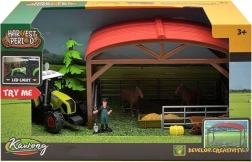 Z pritiskom na gumbe na traktorju se sprožijo realistični zvočni in svetlobni učinki, kar prispeva k avtentični igralni izkušnji. Set vsebuje traktor, ogrado, zavetje za konje in dodatke, ki zagotavljajo veliko ur zabave in ustvarjalnosti.