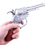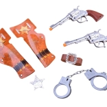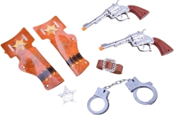 Komplet vključuje vse, kar je potrebno za realistično igro kavbojev: 2 revolverja, lisice, pas in šerifovo zvezdo.
