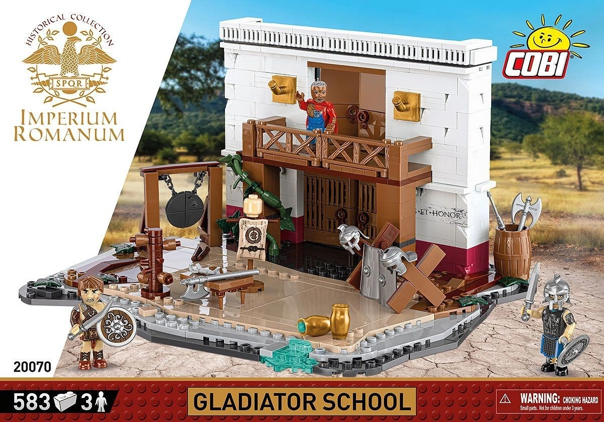 Ustvarite dovršeno dioramo – od rimske arhitekture prek vadbišča do orožarne. Šola gladiatorjev ponuja številne igralne elemente, balkon, odpirajoča se vrata in prostor za vadbene prizore. Zahvaljujoč bogati opremi z orožjem in ščiti lahko figurice različno kombinirate ter uprizarjate dvoboje in urjenje.