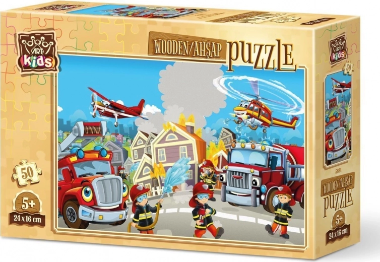 Lesena sestavljanka Gasilci – 50 koščkov iz trpežnega vezanega lesa. Zabavno učenje, kompaktna velikost 24 × 16 cm. Odlično za razvoj motorike in zbranosti.