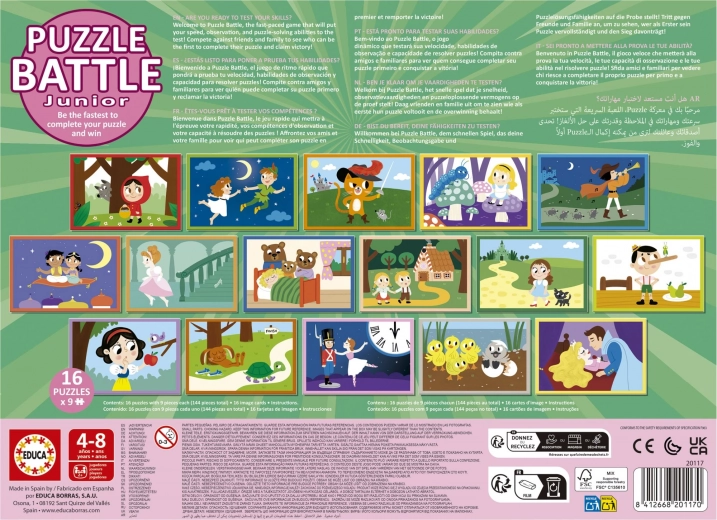 Educa puzzle bitka Pravljice: 16 mini sestavljank po 9 koščkov in 16 predlog. Hitra tekma, zabava in razvoj veščin. Dimenzije ene sestavljanke 16 × 11 cm.
