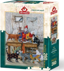 Odkrijte veselje do sestavljanja s puzzlami ART PUZZLE z motivom barvitih mačk. Komplet s 260 kosi ponuja prijeten izziv in sprostitev, po sestavi pa ustvari sliko dimenzij 34 × 48 cm.