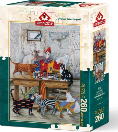 Stilne puzzle z motivom barvitih mačk znamke ART PUZZLE ponujajo 260 kosov in imajo po sestavi dimenzije 34 × 48 cm. Navdušijo z natančnimi izrezi in možnostjo izkoristiti storitev pošiljanja manjkajočega kosa s strani proizvajalca.