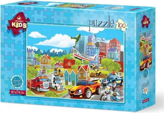 Otroška sestavljanka s motivom prevoznih sredstev, 100 koščkov. Velikost po sestavi približno 48 × 34 cm. Zabava in urjenje logike ter motorike za male sestavljavce.