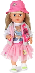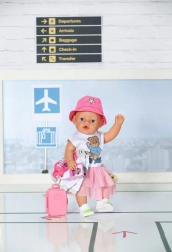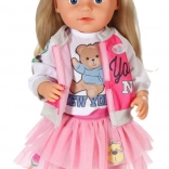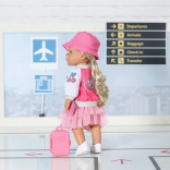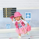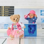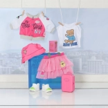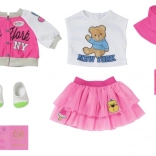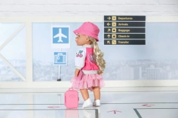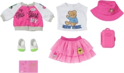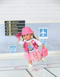 Privoščite svoji punčki BABY BORN popoln potovalni outfit. Ta v rožnate odtenke usklajen komplet združuje udobje in stil – od lahke jakne z ikoničnim motivom NY in igrive majice z medvedkom do puhasto tilastega krila in udobnih čeveljčkov. Del kompleta sta tudi prikupen kovček in potni list za realistične igralne scenarije.