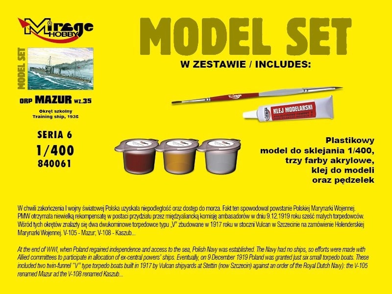 Zgradite ikonični poljski vadbeni torpedni rušilec ORP Mazur v izvedbi wz.35. Ta plastični model za lepljenje izstopa z ostrimi podrobnostmi in odlično sestavljivostjo brez nepotrebnih zapletov. Je odlična izbira za vsakogar, ki želi razširiti svojo zbirko zgodovinskih pomorskih plovil.