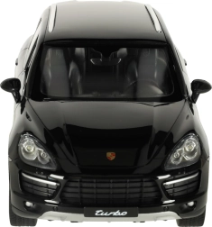 Model Porsche Cayenne Turbo v merilu 1:14 je precizna miniatura, z realističnimi detajli kot so logotip Porsche, sprednje luči in značilna silhueta.