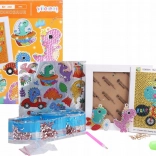 1x okvir, 1x predtiskana slika, 1 list nalepk, 2x obesek, 1x aplikacijsko pero, 1x posodica, 1x vosek, vrečke in set kamenčkov