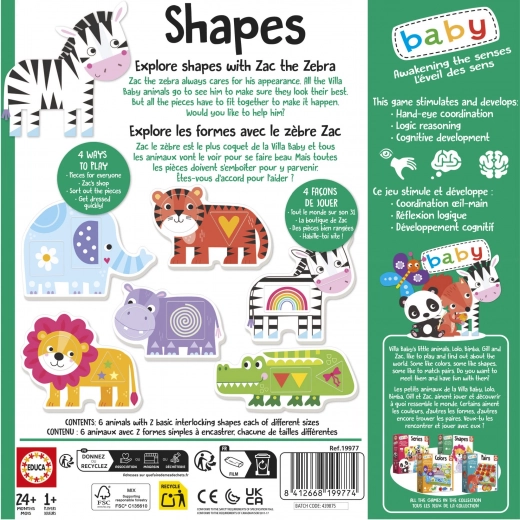 Predstavite svojemu malemu raziskovalcu oblike na igriv način. EDUCA baby vstavljanka razišči oblike z zebro Zakom pomaga otrokom od 24 mesecev razlikovati kvadrat, trikotnik, krog in pravokotnik z ujemanjem slik živalic z dvema povezanima oblikama.