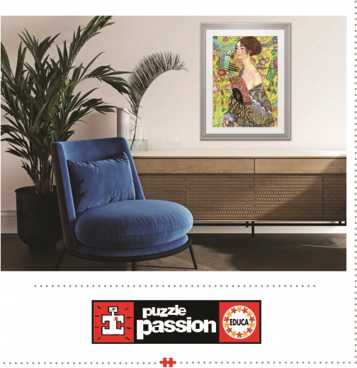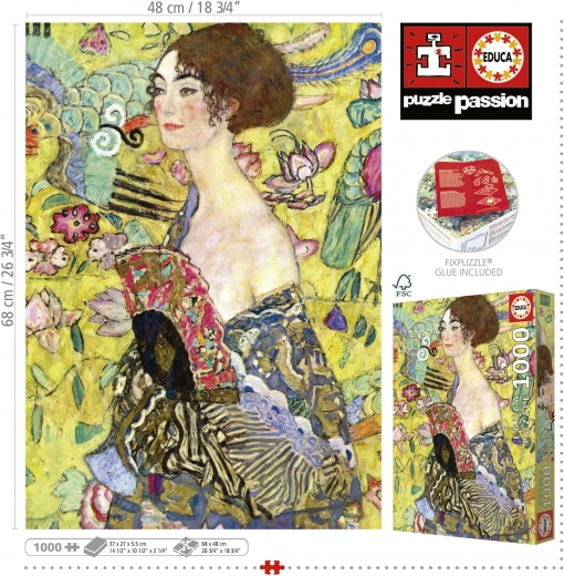 Sestavljanka EDUCA Dama s pahljačo, 1000 koščkov, kakovostna izdelava, dimenzije 48 × 68 cm. Vključeno brezplačno lepilo. Odlična izbira za sprostitev ali darilo.