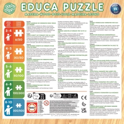 Zahvaljujoč velikim kosom je sestavljanka enostavna za rokovanje tudi za mlajše otroke. Trpežna lesena izvedba in žive barve zagotavljajo dolgotrajno uporabo in privlačen videz. Vsaka dokončana sestavljanka meri približno 26 × 18 cm, idealno za mizo ali otroško podlogo.
