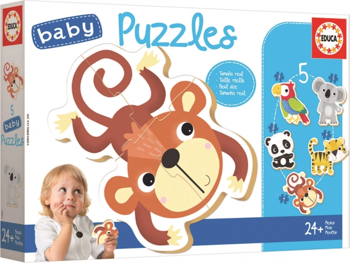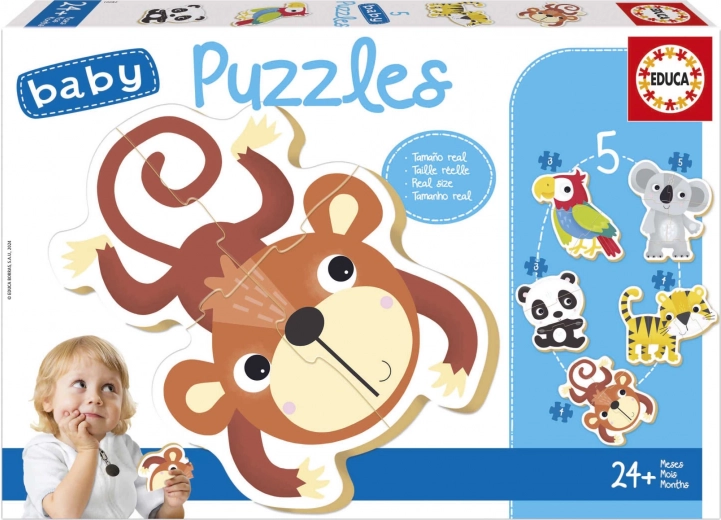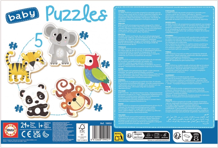 Educa baby puzzle Divje živali 5v1 so posebej zasnovane za malčke, ki s sestavljankami šele začenjajo. Zahvaljujoč postopno večjemu številu koščkov (3 do 5) si otroci na igriv način gradijo samozavest in potrpežljivost. Veliki in debeli koščki so enostavni za prijemanje in se natančno prilegajo.