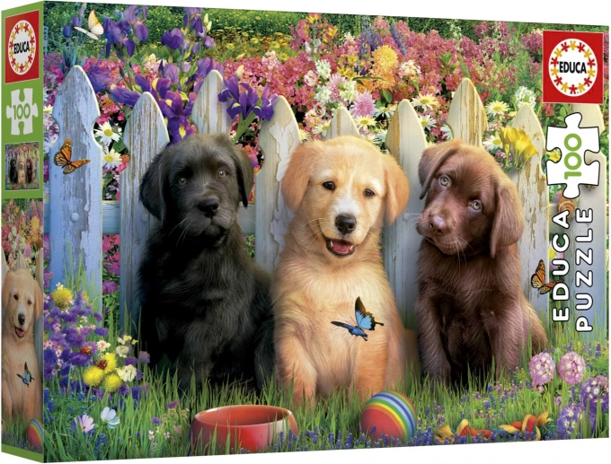 Trije igrivi kužki v pisani vrtni kulisi s cvetjem in metulji pritegnejo pozornost in spodbujajo k sestavljanju.
