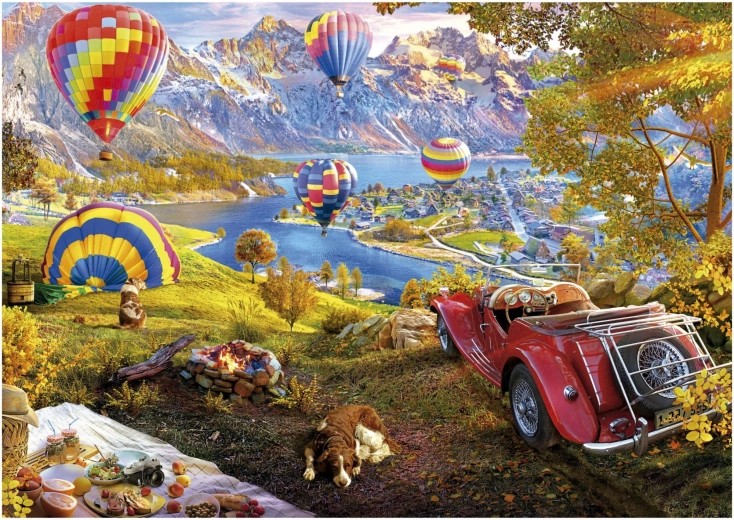 Pokrajina z jezerom, gorami in barvitimi baloni, dopolnjena z rdečim kabrioletom in piknikom, ponuja veliko podrobnosti, ki prijetno olajšajo in pospešijo sestavljanje.