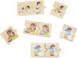 Ta lesena sestavljanka podjetja VIGA otroku omogoča sestavljanje 8 barvitih kompletov puzzle, ki prikazujejo različne dejavnosti otrok v njihovem vsakdanjem življenju. Vključuje priljubljene aktivnosti, kot so umivanje rok, tek ali pihanje svečk na torti.