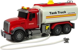 Druge funkcije, kot so zvočni in svetlobni učinki, dodajo celotni zabavi učinek in realističnost. Opozorilne hupa na vrhu signalizirajo gibanje, gumbi na vrhu so odgovorni za zvoke - hupa, zagon motorja, vzvratna vožnja. Zahvaljujoč rdeče-beli barvni zasnovi bo avtomobil viden že od daleč. Cisterna ima trenjski pogon zadnje osi push-pull, dovolj je, da pritisnete na zadnji del, spustite naprej in uživate v hitrosti.