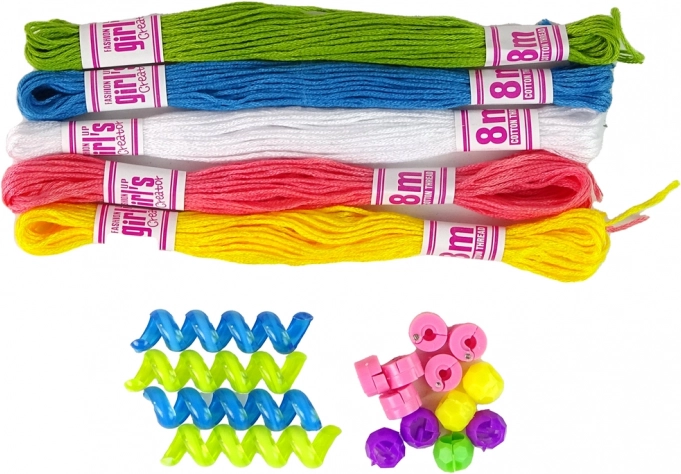 Perle v živahnih barvah in pet osemmetrskih niti (zelena, modra, bela, rožnata, rumena) za neskončne kombinacije in edinstven slog.