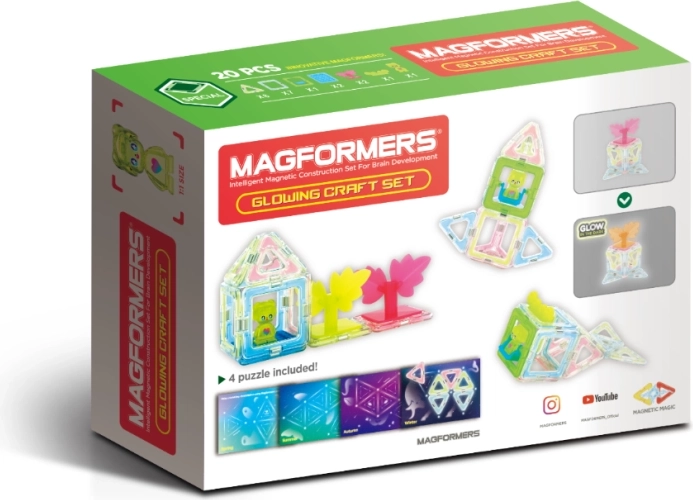 Magformers svetleči gradbeni set prinaša edinstveno izkušnjo s pomočjo posebnih Glow kosov, ekskluzivnih za ta komplet. Ustvarjate lahko različne svetleče scene, cvetlice, hiše in mnoge druge oblike v temi. Kreativni gradbeni set razvija kreativnost in domišljijo, logično razmišljanje, fino motoriko in zavedanje o geometriji.