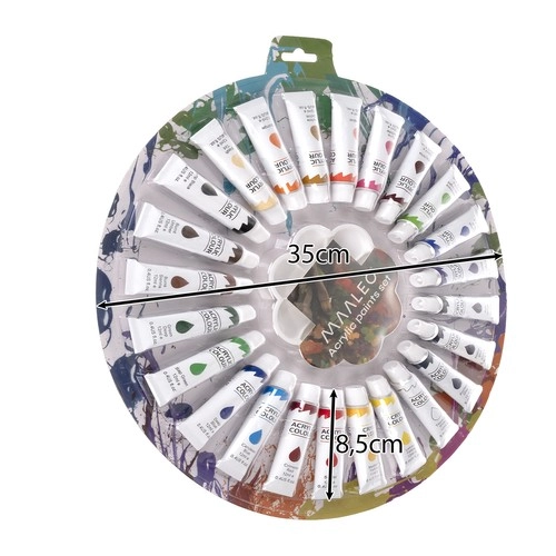 Popoln komplet akrilnih barv s paleto za začetnike in napredne. Vsebuje 24 odtenkov po 12 ml z živahnimi pigmenti, visoko prekrivnostjo in hitrym sušenjem. Barve so enostavno mešljive, razredljive z vodo in po sušenju ustvarijo trpežen, vodoodporen film. Primerno za platno, papir, les, keramiko in tekstil.