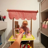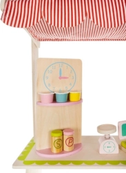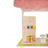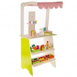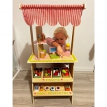 Podarite otrokom lastno tržnico! Slogovna lesena stojnica s streho v črtastem dizajnu, policami in označenimi sekcijami za sadje in vsakdanje potrebščine razvija domišljijo, komunikacijo in fino motoriko. Realistični dodatki – blagajna s skenerjem, plačilna kartica, tehtnica in vrtljiva tabla/»ura« – spremenijo vsak nakup v privlačno pustolovščino.