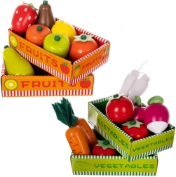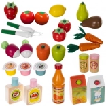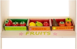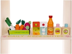 - stojnica, vrtljiva tabla/ura, tehtnica, blagajna s skenerjem, plačilna kartica, 4 košarice za sadje in zelenjavo, začimbe (sol, poper), mleko, pomarančni sok v steklenici in v kartonu, paradižnikova omaka, čili omaka, pudingi (jabolko, breskev, borovnica), 2× korenje, 4× paradižnik, 2× redkev, 2× por z magnetom, limona, 2× hruška, jagoda, paprika, jabolko, barvna embalaža, rjava transportna škatla