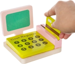 Blagajna s skenerjem, tehtnica, vrtljiva tabla in veliko lesenih živil – vse, kar otroci potrebujejo, da odprejo svojo trgovino in vadijo socialne veščine.