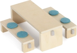 Jedilna miza s klopmi in tabureji ustvarja prijetno okolje za punčke.
