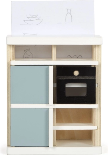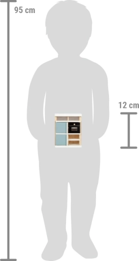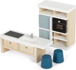 Ta lepo zasnovan kuhinjski set za hiško za punčke prinaša realistično igralno izkušnjo. Sestavljen je iz visoke kuhinjske omare, otoka s koritom in kuhalno ploščo ter jedilne mize z dvema klopema in tabureji. Kuhinjska omara vključuje kombinirani hladilnik z zamrzovalnikom in pečico z odpirajočimi se vratci.