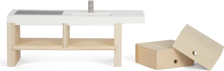 Otok s kuhalno ploščo in pomivalnim koritom ponuja realistično funkcionalnost v igralnem okolju.