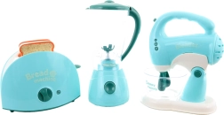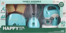 Ta komplet kuhinjskih aparatov vsebuje toaster, mešalnik in stepalnik. Vsak aparat deluje na 2 bateriji AA, ki niso priložene. Po vstavitvi baterij toaster sveti in oddaja zvoke, mešalnik se vrti in oddaja zvoke, stepalnik sveti, oddaja zvoke in metlice se vrtijo. Material: plastika. Pakirano v škatli. Mere pakiranja približno 43 × 22 × 9,5 cm. Starost 3+.