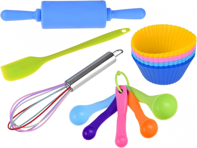 Vključuje valjar, metlico, lopatico, modelčke za piškote in mafine ter druge uporabne dodatke za zabavno peko.