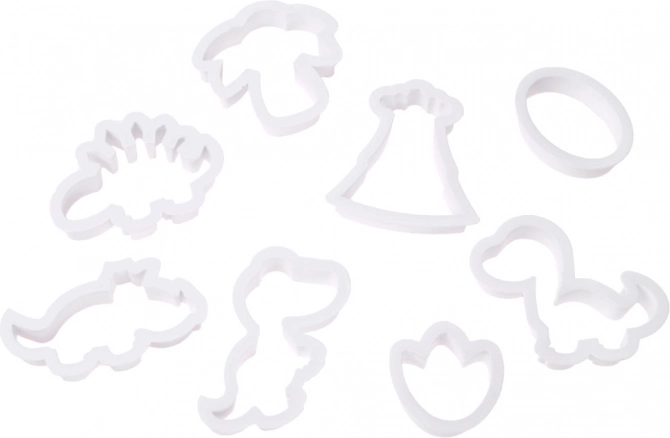 Komplet vsebuje modelčke v obliki dinozavrov, drevesa in vulkana, ki prinašajo ustvarjalne možnosti pri peki z otroki.