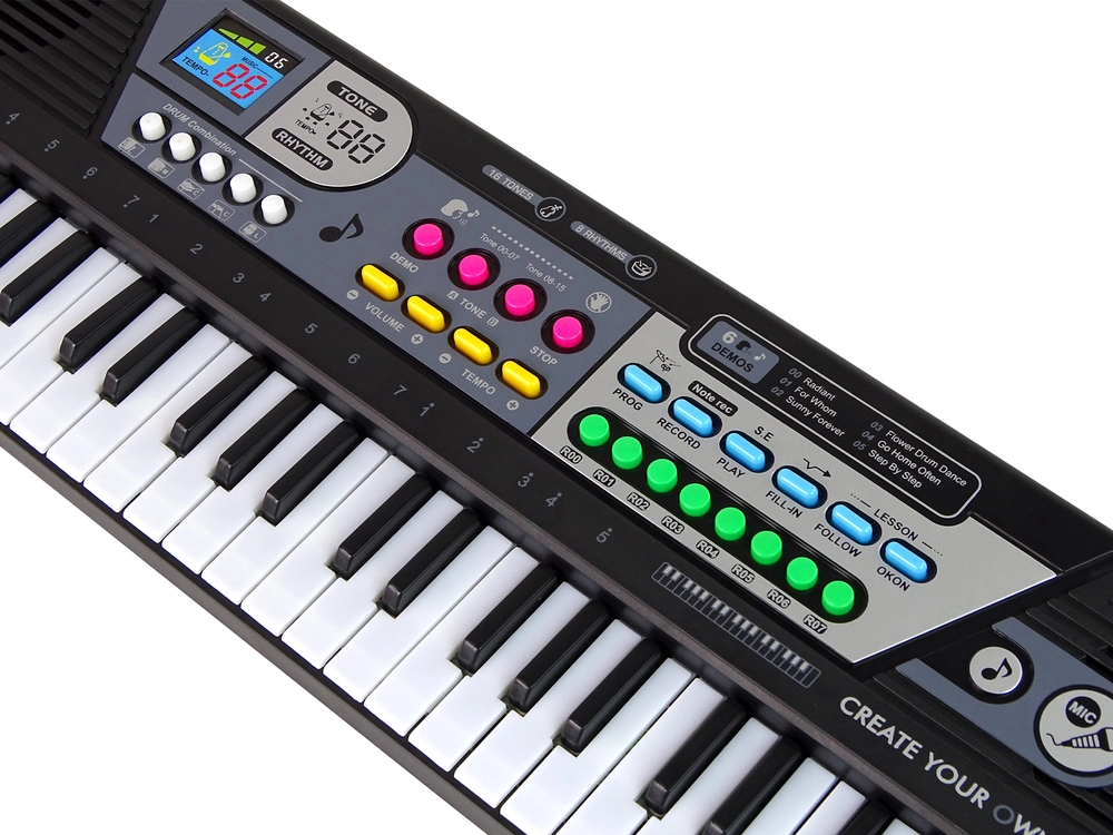 Ta tipkovnica ima kar 49 tipk, kar omogoča preprosto in naravno igranje. Vgrajeni mikrofon omogoča petje najljubših pesmi, kar bo zagotovo navdušilo otroke, ki želijo eksperimentirati z vokali. Gumbi so enostavni za upravljanje, ergonomska zasnova pa zagotavlja zelo udobno uporabo izdelka. Lahka konstrukcija omogoča prenašanje igrače in postavitev na mizo ali pisalno mizo, tako da lahko vaš otrok prireja nastope v katerem koli kotičku doma. Zunanji vhodni priključek omogoča poslušanje najljubših pesmi.