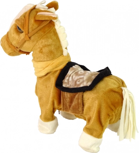 Plišasti rjavi konjiček s svetlo grivo je idealen spremljevalec za vsakega otroka, ki si želi živalskega prijatelja. Konjiček je opremljen z interaktivnimi funkcijami, ki vključujejo gibanje, glasbo in zvočne učinke. Po vstavitvi baterij je dovolj pritisniti gumb, da se konjiček začne igrati in premikati.