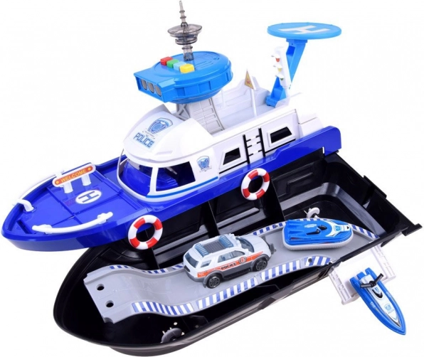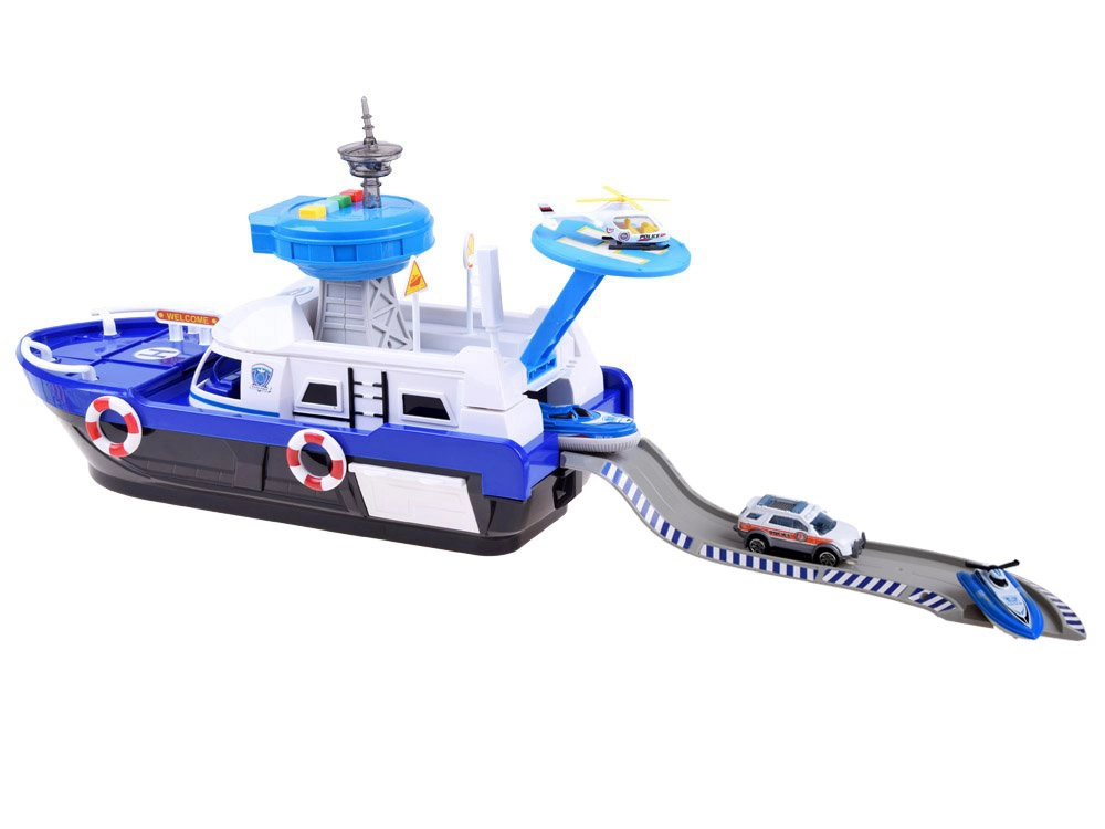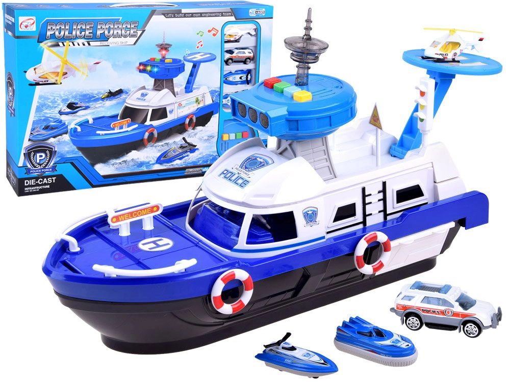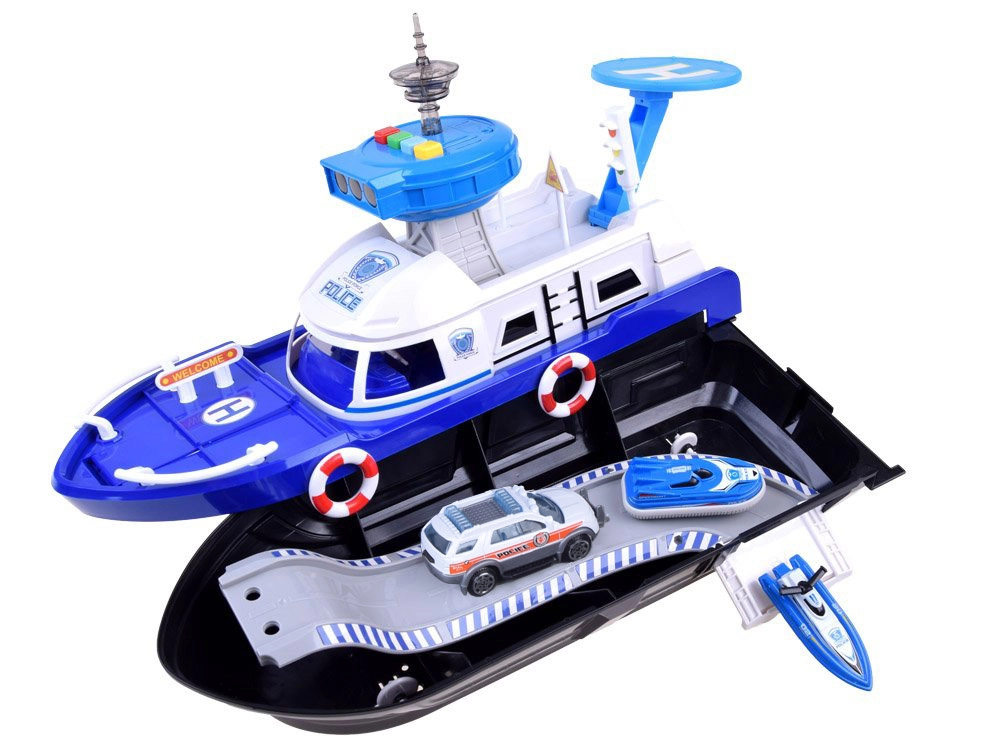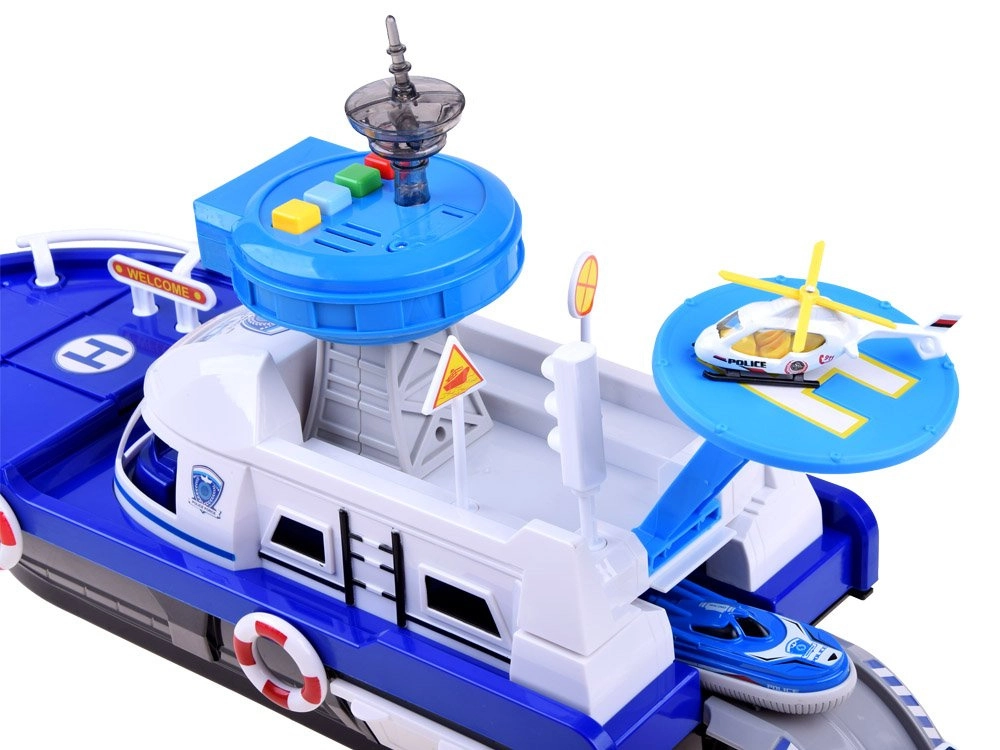 Ta podrobno izdelan policijski čoln v belo-modri kombinaciji je pripravljen na vsako misijo – na vodi, na kopnem in v zraku. Na krovu najdete helipad s helikopterjem, kontrolni stolp s svetlobnimi in zvočnimi učinki ter notranji shranjevalni prostor za prevoz vozil. Odpirajoči se kokpit s krmilom in figurico kapitana še poveča realizem igre.