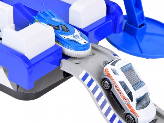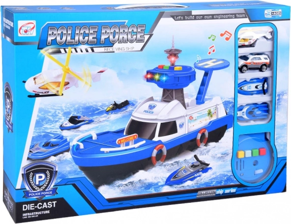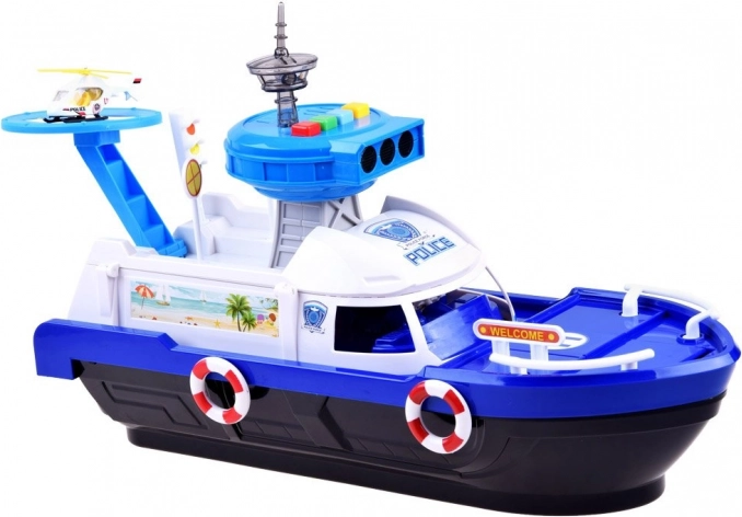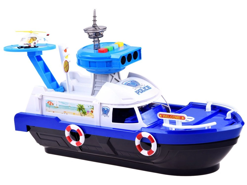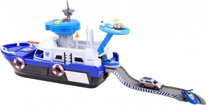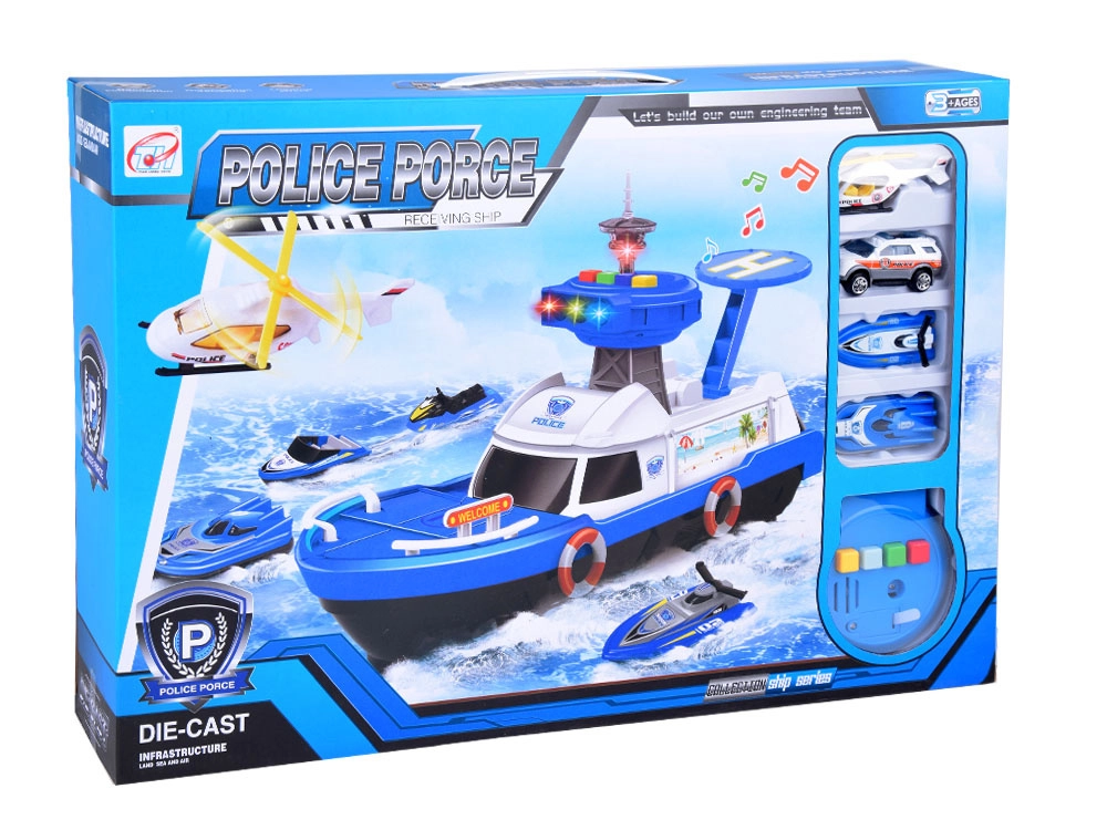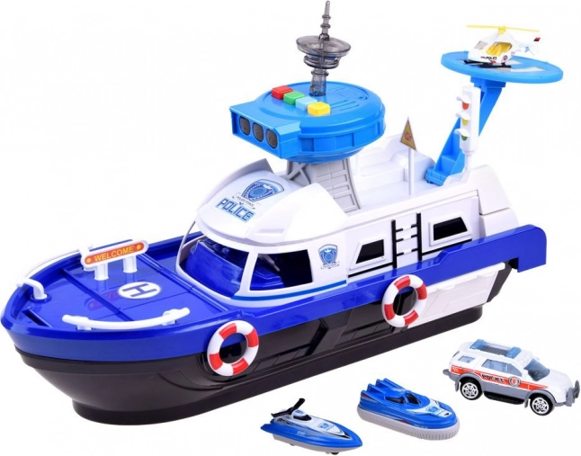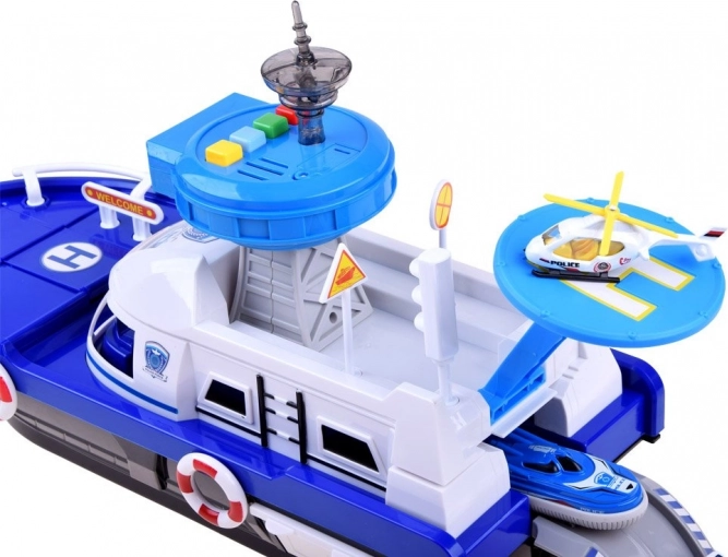 Ta podrobno izdelan policijski čoln v belo-modri kombinaciji je pripravljen na vsako misijo – na vodi, na kopnem in v zraku. Na krovu najdete helipad s helikopterjem, kontrolni stolp s svetlobnimi in zvočnimi učinki ter notranji shranjevalni prostor za prevoz vozil. Odpirajoči se kokpit s krmilom in figurico kapitana še poveča realizem igre.