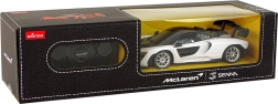 Elegantna bela karoserija z izrazitimi aerodinamičnimi elementi in zatemnjenimi stekli zvesto povzema ikonični MCLAREN Senna.
