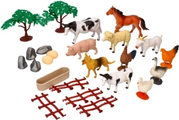 Set vsebuje plastične živali različnih velikosti, vključno s kravami, konji, ovcami, kokošmi, drevesi in drugimi dodatki, kot so ograje, kamni in jajca, ki zagotavljajo izobraževalni in ustvarjalni razvoj.