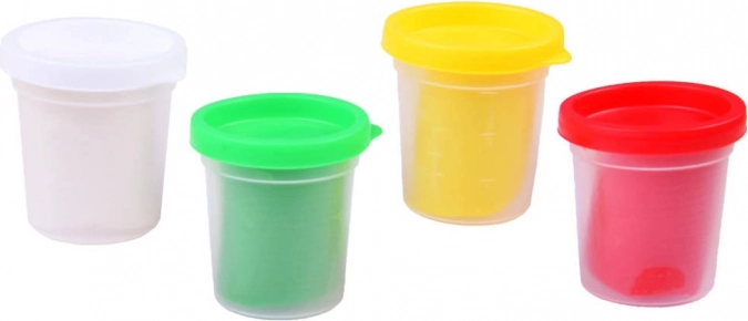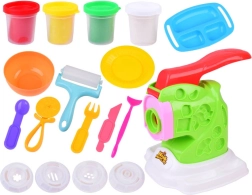 Valjar, nožek, vilica, žlička, rezalnik za pico, spatula ter servirna posodica dopolnjujejo 4× modelirna masa v osnovnih barvah – idealno za kreativne kuharske prizore.