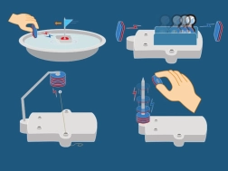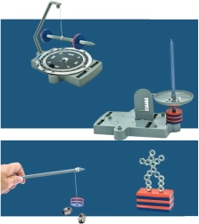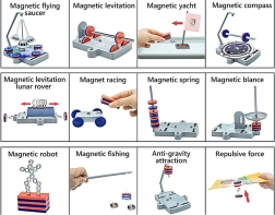 Sestavljiv voziček, vrteči se diski in drugi mehanski elementi prikazujejo magnetno silo v gibanju ter spodbujajo k nadaljnjim poskusom.