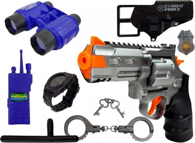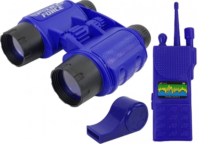 Lisice s ključi, značka, radijska postaja, piščalka in daljnogled – vse, kar mali policist potrebuje za napeto misijo.