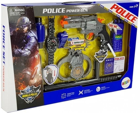Ta vsestranski policijski komplet je idealen za preoblačenja, karnevale in vsakodnevno igro junakov. Realistična izdelava in bogata oprema spodbujata razvoj domišljije, igranje vlog in sodelovanje več otrok. Pištola v elegantni srebrno‑črni barvi ob pritisku na sprožilec in pri ponovnem polnjenju sveti in oddaja zvok strela, kar daje igri dodatno pristnost.