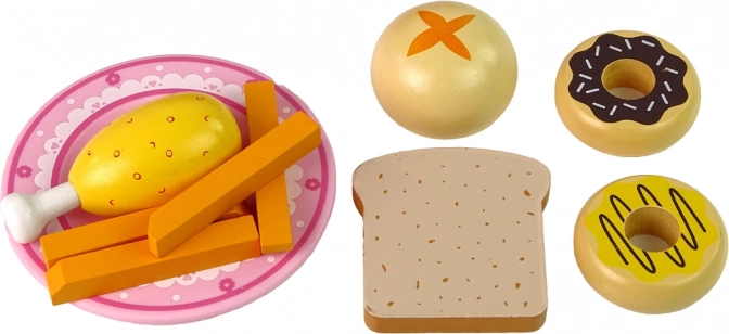 V kompletu so krožnik in izbor živil: krofi, pekovsko pecivo, pomfri in piščančji bedrček – idealno za serviranje in igro kuharja.
