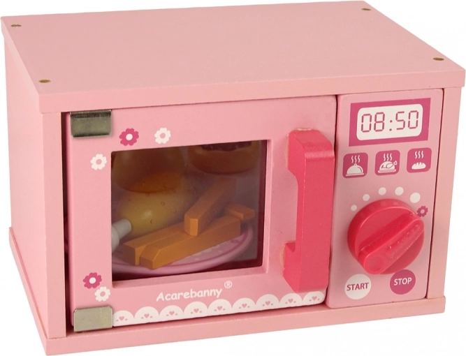 Lesena mikrovalovna pečica za otroke – rožnat komplet s hrano