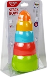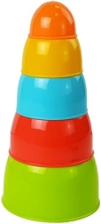 Ta barvita piramida iz skledic omogoča otrokom gradnjo stolpa, vstavljanje skledic eno v drugo ter razvrščanje po velikosti ali barvi. Igra naravno razvija motoriko prstov, prijem in koordinacijo oko–roka ter hkrati uči razumevanje velikostnih razmerij.