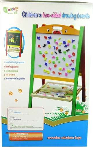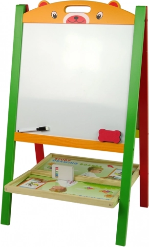 Ta lesena dvostranska tabla 2v1 podpira otroke pri ustvarjalnem izražanju in zgodnjem učenju. Na beli strani lahko pišejo in rišejo s piši-briši flomastrom, zelena magnetna površina pa je idealna za sestavljanje besed iz črk in vadbo računanja s številkami in znaki. Stabilen okvir in praktična polička/predal ohranjata vse pri roki.